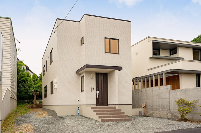 縁どったような屋根とサッシのカラーが程よいメリハリを与えている。