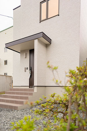 厚みを持たせたポーチの庇と袖壁がデザインのポイントに