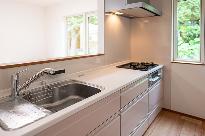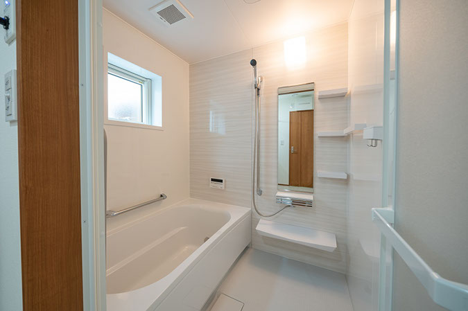 白系にまとめたユニットバスは、窓を設ける事で室内がより明るく、