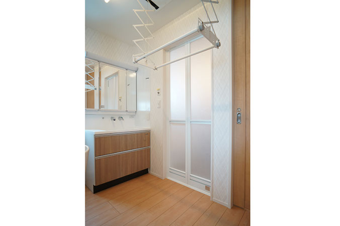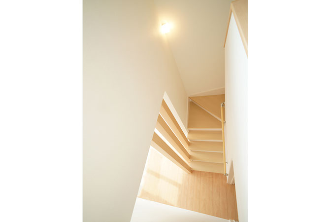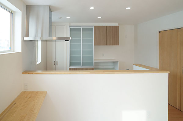 コンロ前の壁を設けず、笠木のみですっきり仕上げたキッチン。