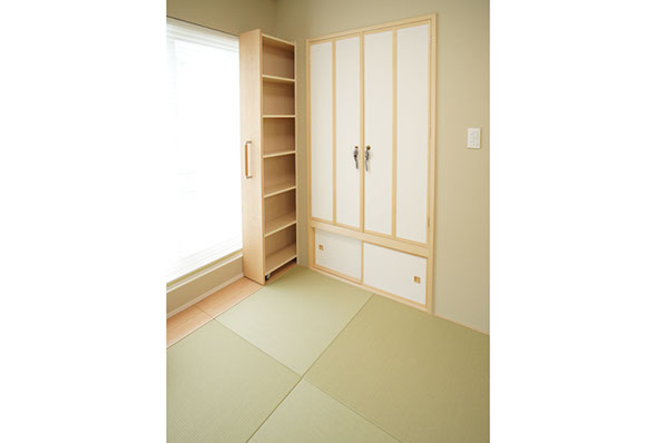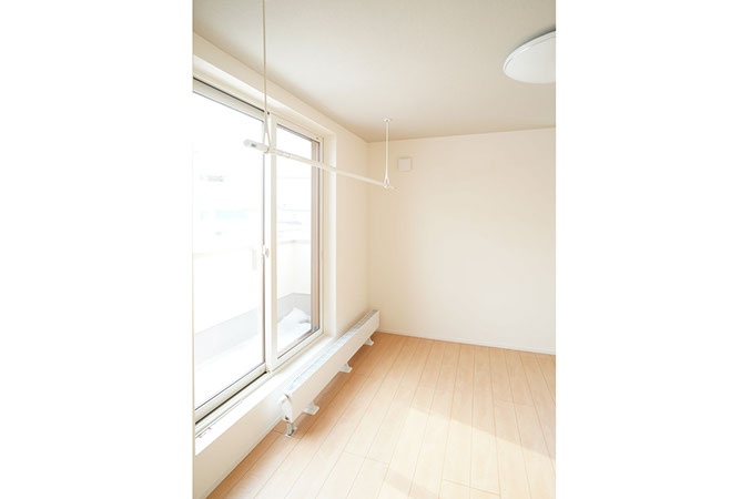 寝室には洗濯物も干せる取り外し可能な物干し。
