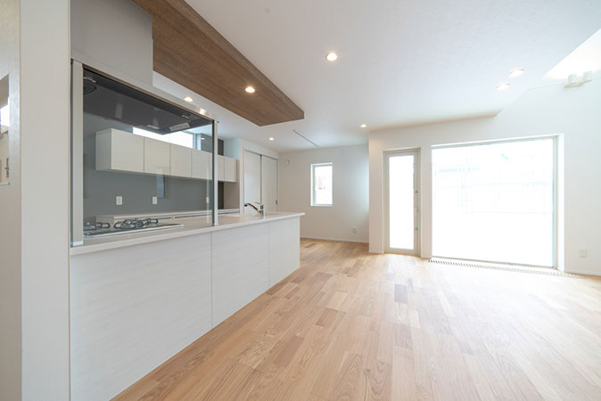 対面のオープンキッチンからは明るいリビングが見渡せる。