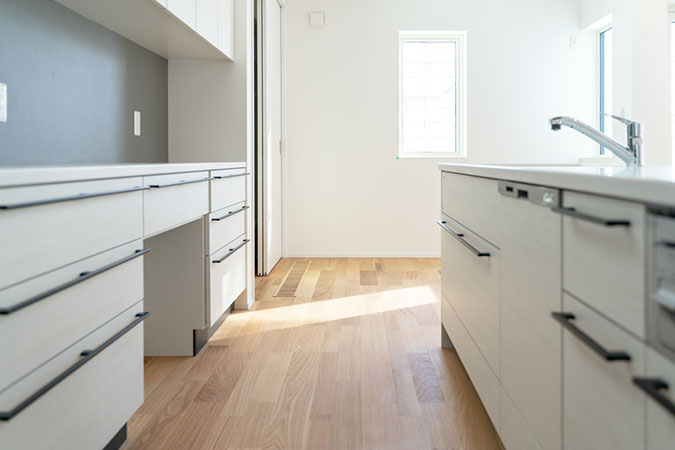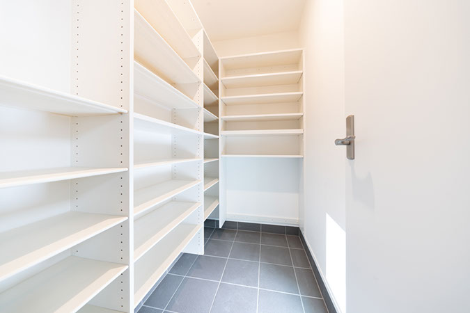 W2700のキッチン収納に加えて食品庫も備え充実の収納。