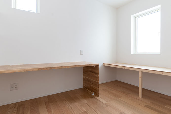 ご主人の趣味のスノーボードメンテナンススペースは作業台も備える。