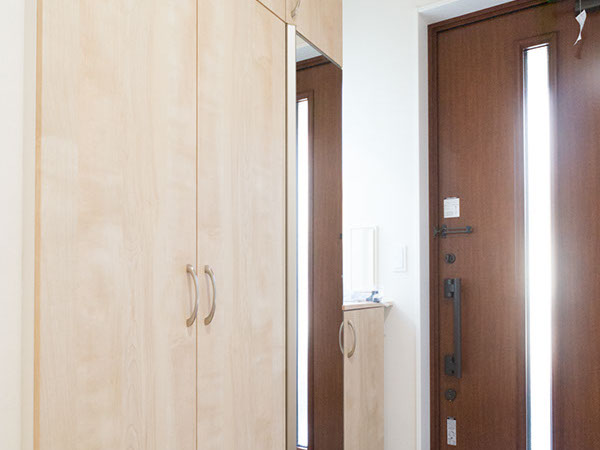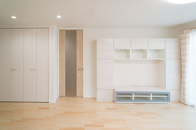天井近くまである建具と、すっきりしたホワイトのテレビボードで