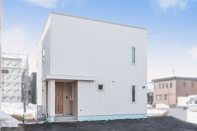 ポーチ上の白い庇がアクセントのさわやかな外観。