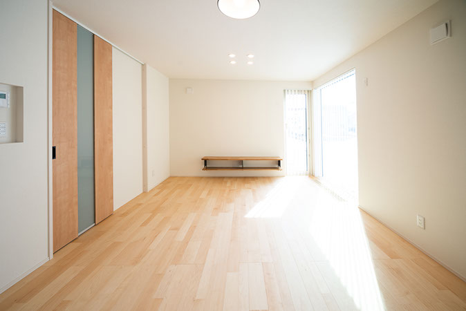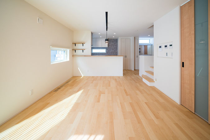 コーナーに配置された窓から明るい光が差し込むリビング。