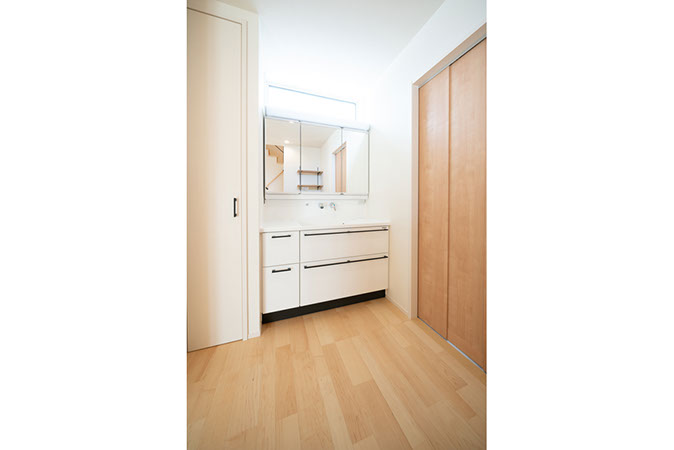化粧台のすぐ横に収納扉を設け、タオルや洗剤ストックも仕舞える。