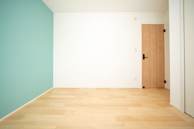 子供らしく明るい壁紙をアクセントにした子供部屋 。
