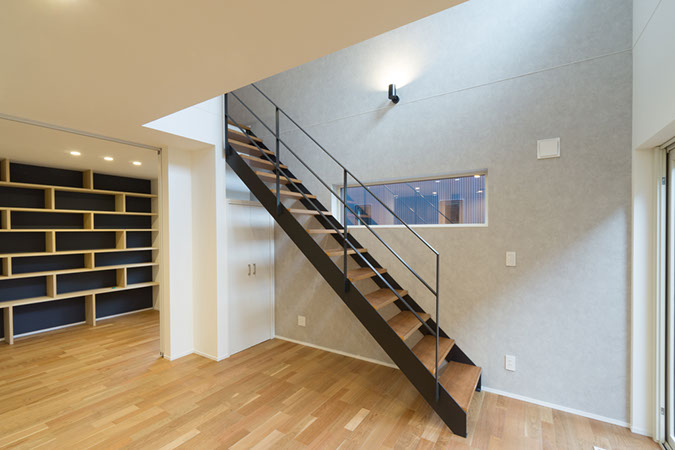 ストレートの鉄骨階段と、奥に見える造作棚のデザインが印象的。