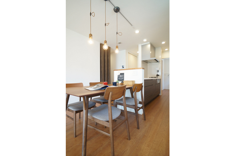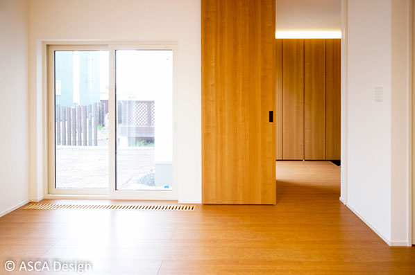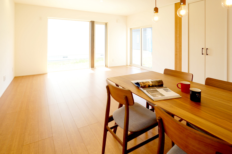 リビングは南東の2面に庭にも出られる大きな窓を配置