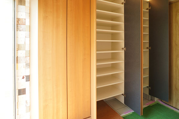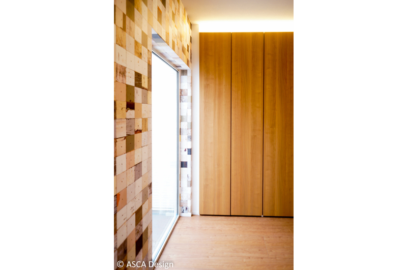 デザインクロスと上部に間接照明のついた収納が印象的なエントランス