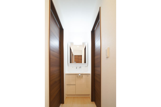 洗面化粧台は脱衣室の外に置き、浴室が使用中でも気にせず使える工夫を。