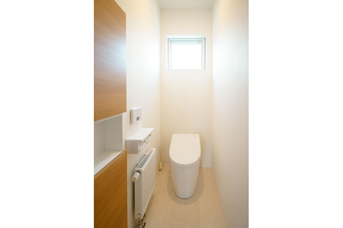 人気のタンクレストイレと高級感のある大理石風のフロアー材。