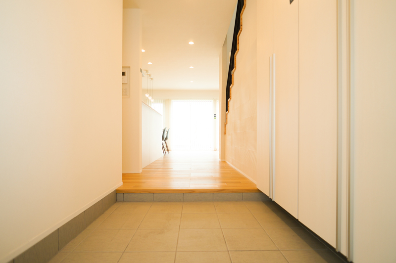 玄関から正面の窓へとつながる奥行を感じさせるエントランス