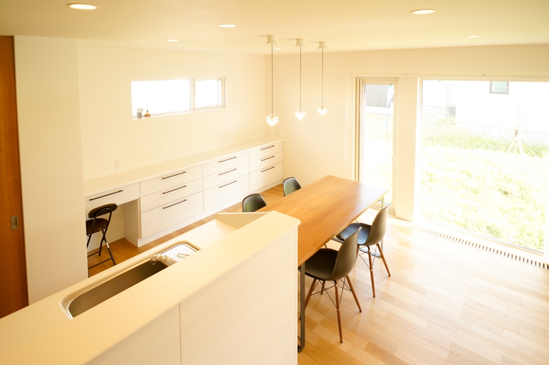キッチンの横に配置したダイニング。背面にも充実の収納