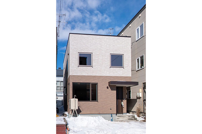 温かみのある2色のサイディングを上下に貼り分けた外観。