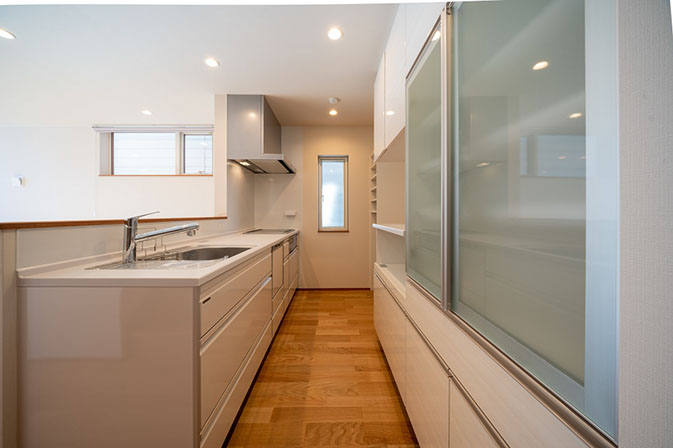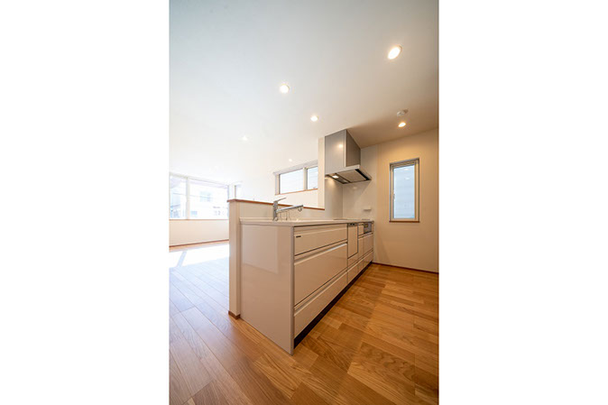 キッチン側から明るいリビングが見渡せる対面式プラン。
