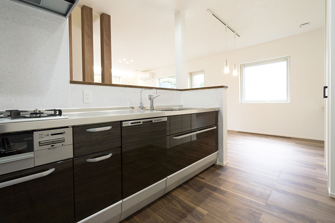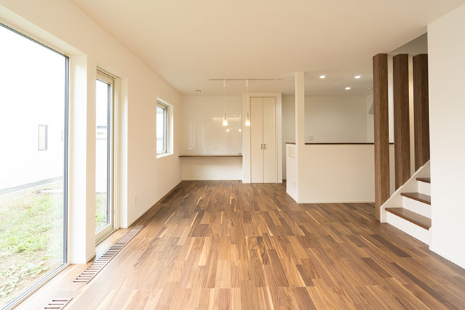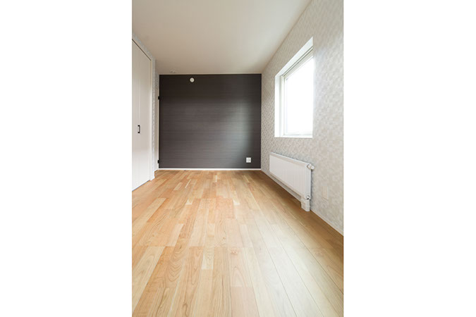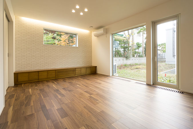 テレビボード上の窓は外の紅葉を切り取ったようなピクチャーウインドウに。