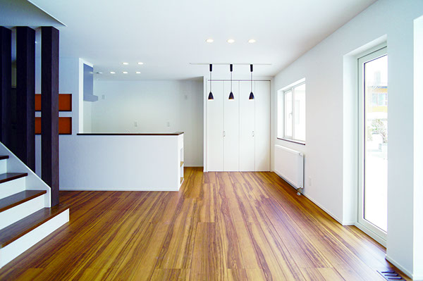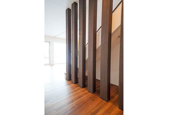 階段横の壁をスリット状の柱にして空間に抜け感をプラス
