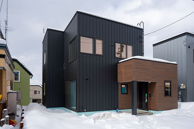 落ち着いた色味の外観はポーチの柱部分の色を変えてアクセントに。