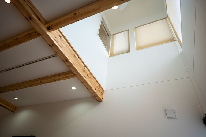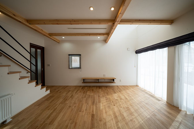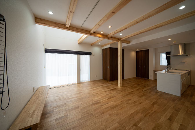 無垢のフローリングと天井のあらわし梁が印象的なリビング。