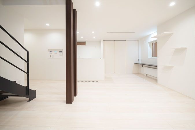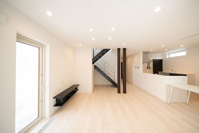 リビング側から見える鉄骨階段がシンボリックな1Fエリア