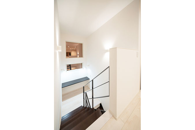 大きな窓のある階段の踊り場はスタディースペースに
