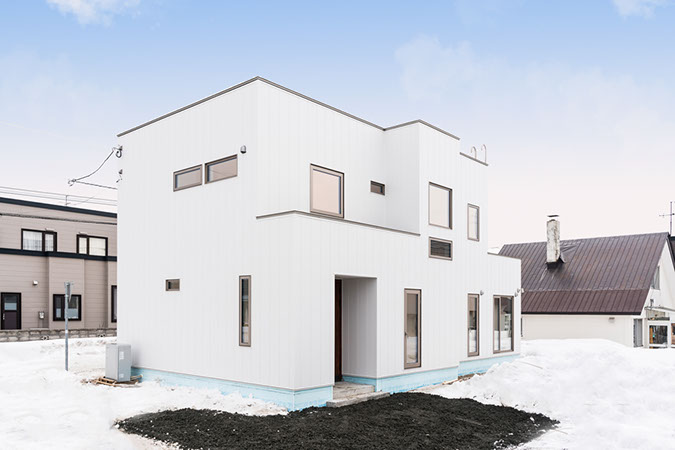 ホワイトの金属サイディングを使用した外観。