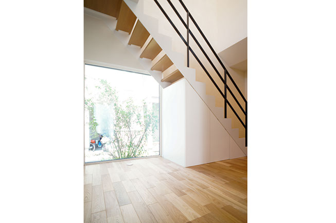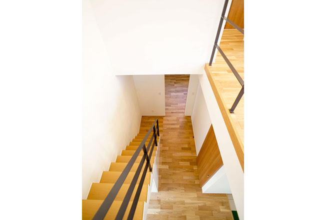 階段上の吹き抜けから階下へも明るい光が差し込む。