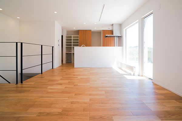 2階リビングの明るい空間。キッチン背面の扉の奥はパントリー。