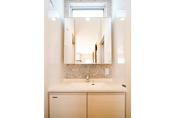 洗面化粧台の扉と天板は同柄のメラミン素材。