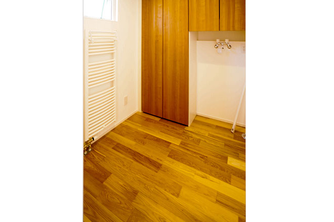 洗濯機の周囲はすっきりと見える扉付の収納に