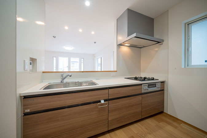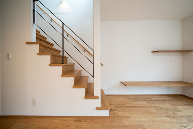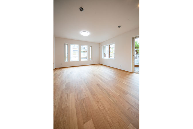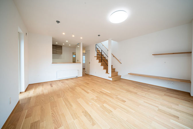 やわらかい雰囲気のオークの床が映えるシンプルなLDK