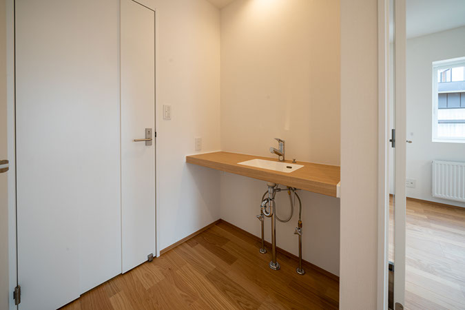 カウンター一体型の手洗い器はスリムなデザインで空間になじむ
