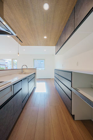人大シンクやグースネック型のタッチレス水栓を採用しデザイン性と機能性を兼ね備えたこだわりのキッチン