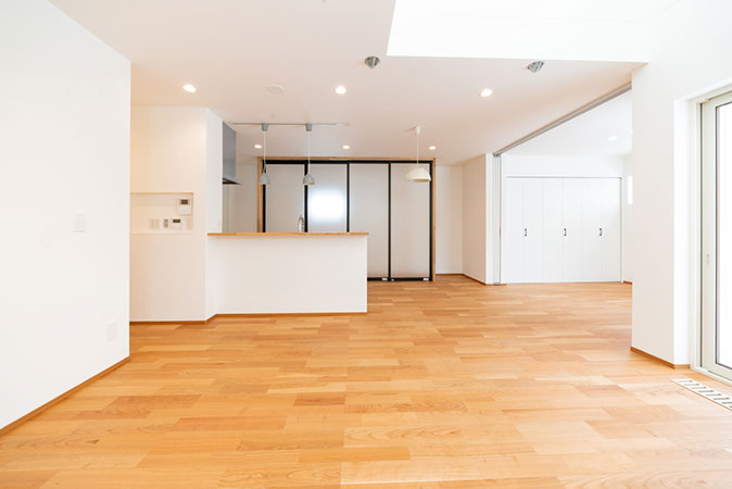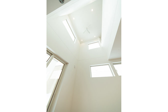 リビングの上の吹き抜けは2Fのフリーホールへつながる