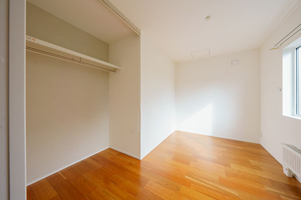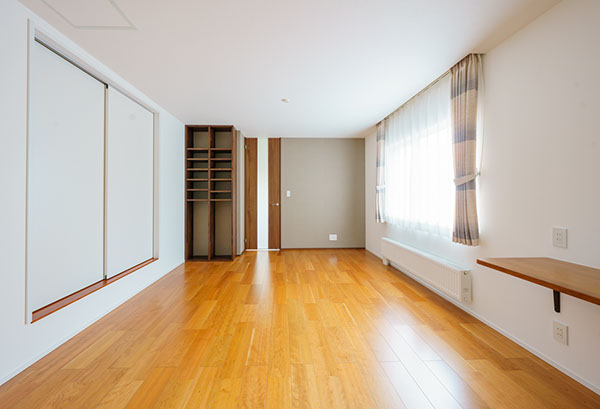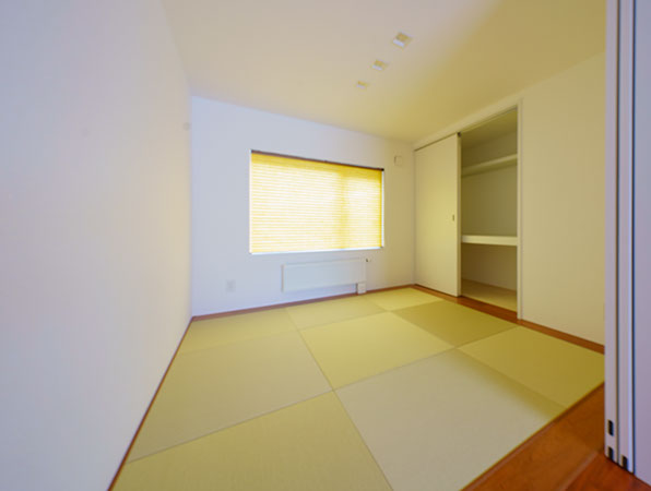 小上がりの和室は、明るい色のプリーツスクリーンや