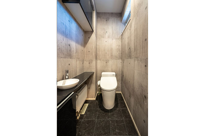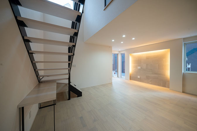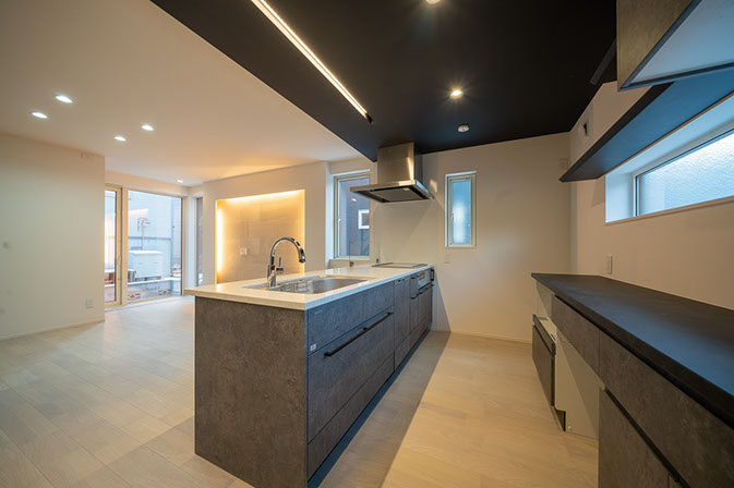 石目調の高級感のあるキッチンが映えるモノトーンのLDK
