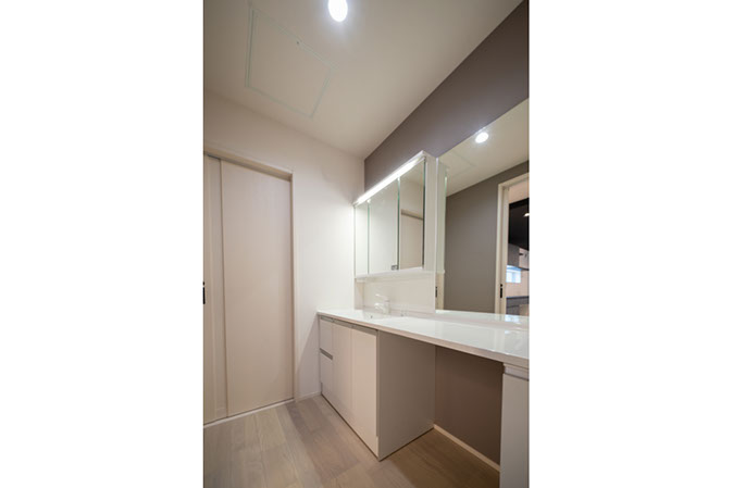 ホワイトでまとめた洗面化粧台は壁面もミラー貼りにし、