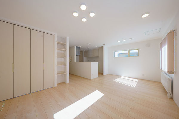 明るく広々としたLDには、たっぷりサイズの扉付きの収納と