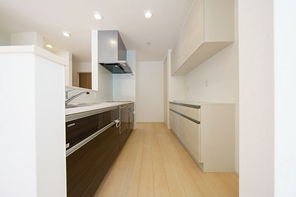回遊型のキッチンは、取っ手の出っ張りがない