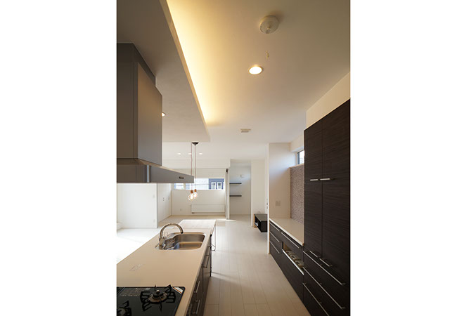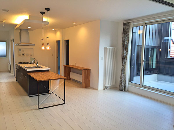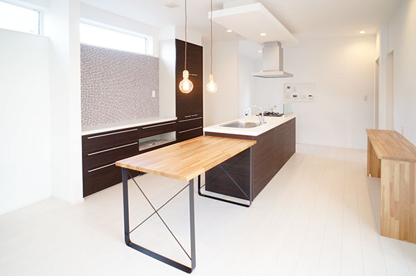 ダイニングテーブルとカウンターは素材を合わせた造作のもの。