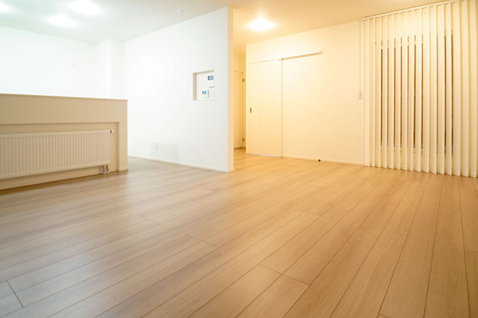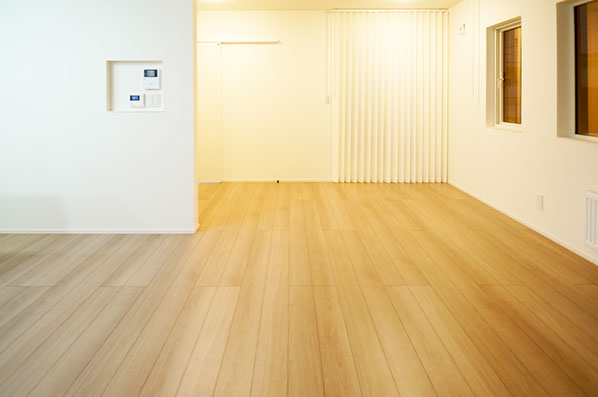 トレンドのグレージュカラーのフローリングを使用した室内。