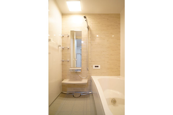 ユニットバスには、汚れ・キズに強く、乾きも早い磁器タイルの床材を使用。壁パネルはホーロー製で清掃性、耐久性も抜群。