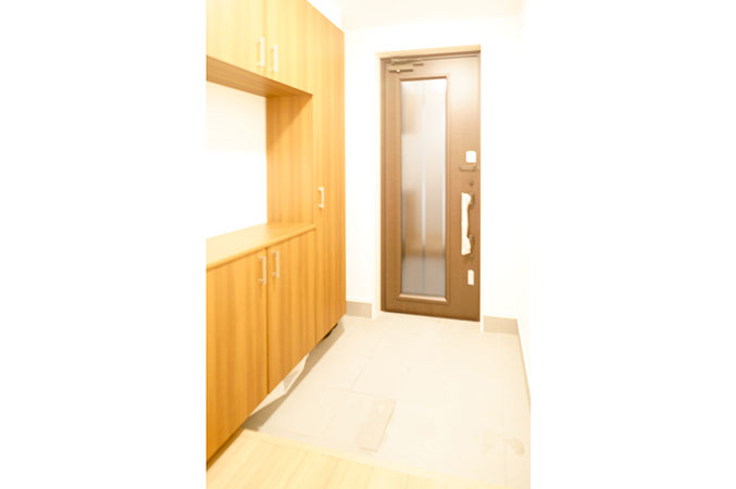玄関ドアはガラス面の大き目なものを選び、暗くなりがちな玄関に光を取り込む。