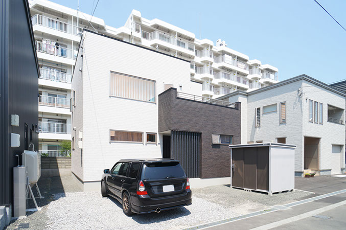 すっきりした色合いながら石目柄のサイディングで存在感を出した外観。